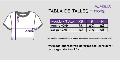 Para hacer estas tablas de talles no consideramos el volumen de la prenda, al ser prendas planas NO tenes que medirte vos. La medida se hace de la prenda apoyada sobre una superficie plana sin estirar. Al ser un producto NO industrial tené en cuenta que pueden tener un margen de tolerancia de +/- 1,5 cm.